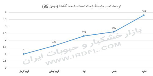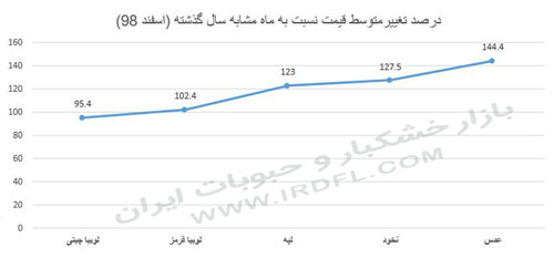 براساس آخرین گزارش منتشر شده در مرکز آمار ایران، درخصوص افزایش درصد قیمت مواد غذایی در اسفند 99، اقلام مصرفی دو گروه لبنیات، تخم مرغ و انواع روغن و میوه و خشکبار با بالاترین درصد افزایش قیمت مواجه بوده اند. در بررسی های صورت گرفته از 53 کالای منتخب، مشخص گردید 39 کالا افزایش قیمت بالاتر از نرخ تورم را داشته اند.